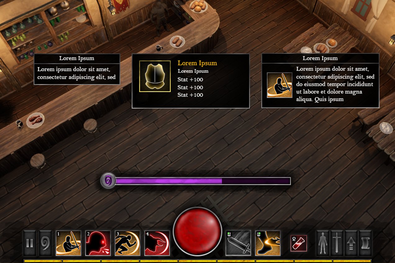 In-Game HUD elements including Health Bar, Skill Hotbar, Experience Bar, Menu Buttons, Potions, Enemy Health, Status Effects and Tooltips.